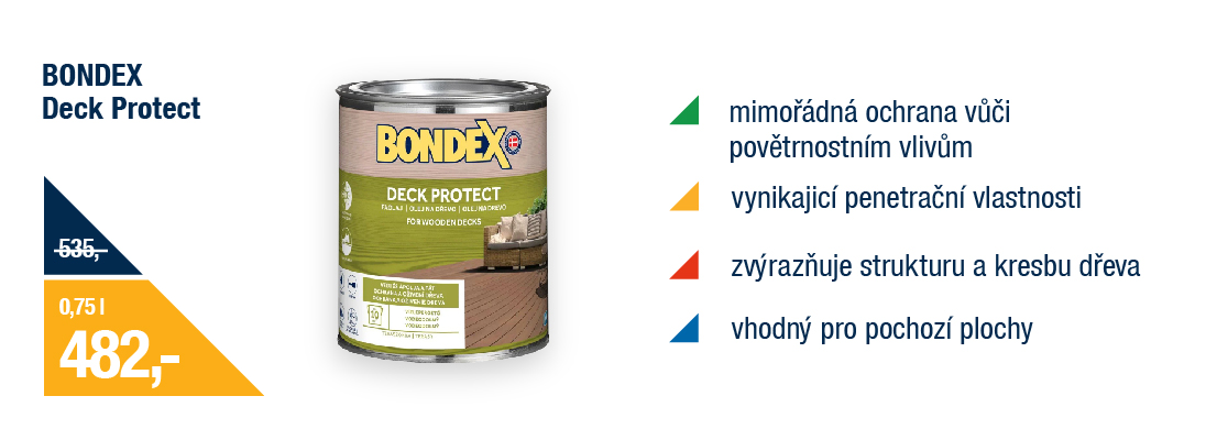 Vaše terasa si zaslouží jen to nejlepší, od toho je tu Bondex Deck Protect, který se vsákne hluboko a dřevo chrání zevnitř. Prodlouží životnost a nechá vyniknout přirozený vzhled.
