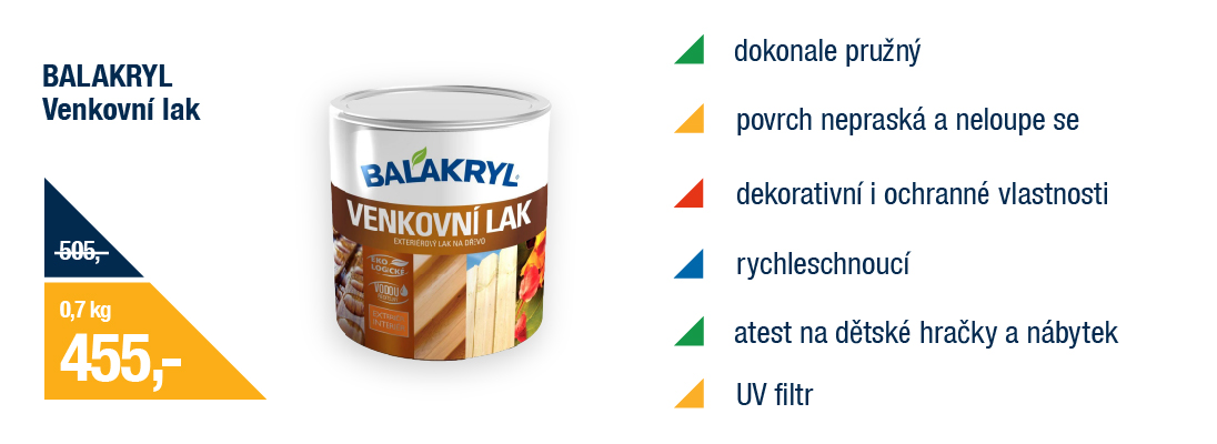 Vodou ředitelný, rychleschnoucí a ideální na venBalakryl Venkovní lakchrání před deštěm, sluncem i změnami počasí, aniž by zakryl přirozenou krásu dřeva.