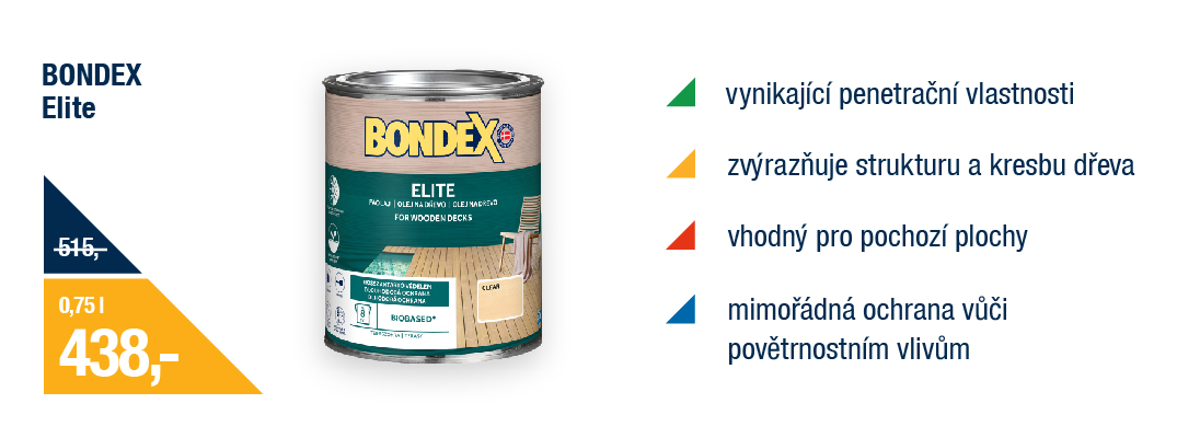 Chcete dopřát svému dřevu prvotřídní péči? Bondex Elite je prémiová lazura, která chrání i zdobí. Zvýrazní kresbu dřeva a ochrání ho před sluncem i deštěm. Krása a výkon v jednom tahu.