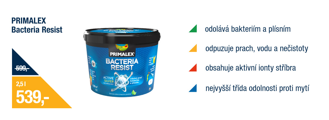 Jestli chcete barvu, která odolává bakteriím, plísním i dezinfekčním přípravkům, obsahuje aktivní ionty stříbra, pak nesmíte přehlédnout Primalex Bacteria Resist.