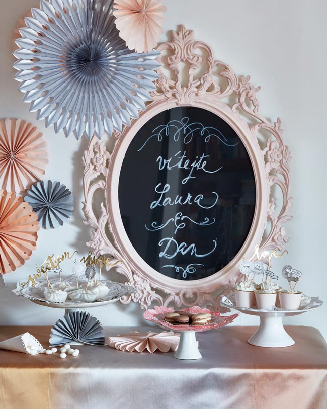 Máte doma starý rám, pro který už nemáte využití? Co takhle ho použít na informační svatební tabuli? Budete potřebovat: starý rám, tvrdý karton, nůžky, štětec, barvu Primalex Inspiro v jakémkoli jemném a černém odstínu, bílý popisovací fix.