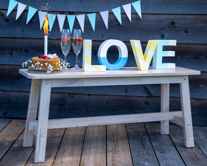 Postup: Písmena očistěte od nečistot. Plochu písmen, kterou chcete ponechat bílou, přelepte bílou páskou. Sprej Primalex s křídovým efektem před použitím důkladně protřepejte a barvu aplikujte rovnoměrně v tenké vrstvě ze vzdálenosti 20–30 cm. Druhou vrstvu pak nanášejte kolmo k předchozímu směru nástřiku. Barvu nechte zaschnout 5–10 minut. Pokud chcete, můžete na závěr použít Primalex sprej se třpytkami.