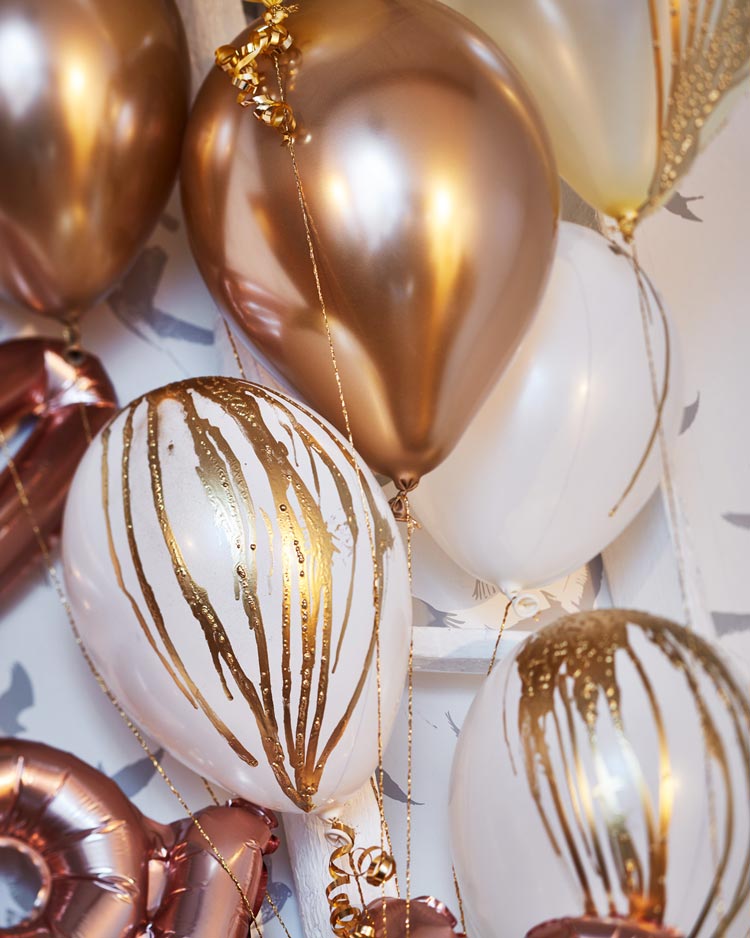 Svatební balónky jsou zábavnou a hravou formou dekorace, která upoutá pozornost každého hosta. Doporučujeme zvolit balónky v barvách odpovídajících vaší svatební tematice a vytvořit s nimi různá aranžmá, jako je oblak balónků, který bude zdobit taneční parket nebo strop, nebo je použít do foto koutku. Budete potřebovat: světlé nafukovací balónky různých velikostí, helium, stuhy, Primalex Metalický sprej.