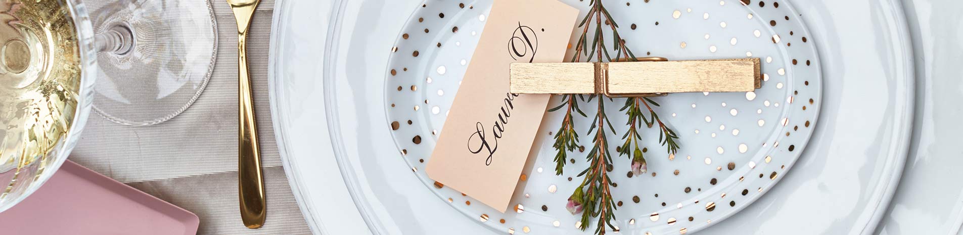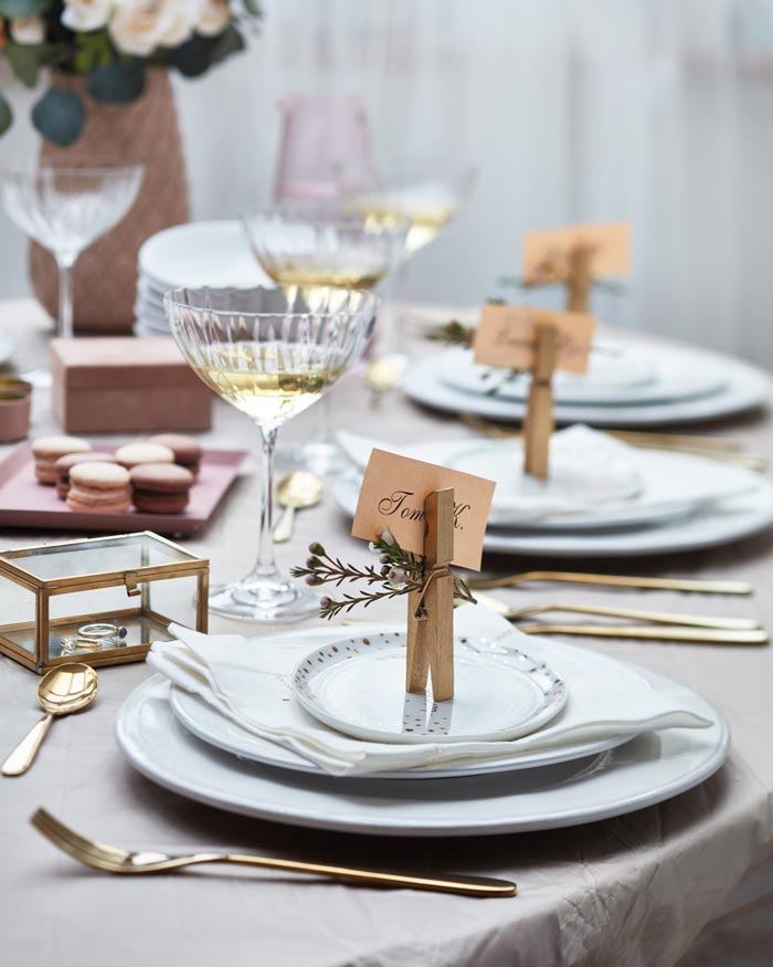 Postup: Dřevěné kolíčky nasprejujte zlatým sprejem Primalex v několika vrstvách a nechte pořádně zaschnout. Mezitím si v počítači napište ozdobným fontem jména svatebních hostů. Vytiskněte na barevný papír a jednotlivé jmenovky vystřihněte. Nakonec je vložte spolu s drobnou květinou do kolíčku a postavte nebo položte na talíř.