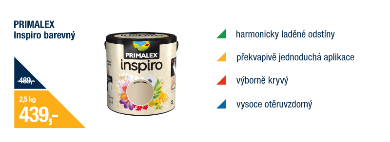Primalex Inspiro využijete pro malování interiéru, skvěle kryje, jednoduše se aplikuje a zanechává dokonalý vzhled. Vybrat si můžete z několika designových odstínů.