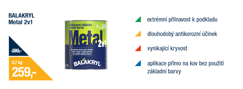 Balakryl Metal 2v1 je antikorozní matná barva vhodná na všechny druhy kovů, plechů, dřevo, beton a další bez použití základní barvy.