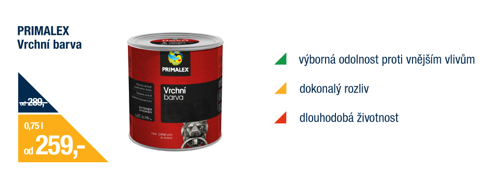 Pokud potřebujete natřít dřevo nebo kov, doporučujeme Primalex Vrchní barvu, která má dlouhodobou životnost a výborně odolává vůči vnějším vlivům.
