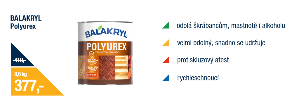 Balakryl Polyurex je rychleschnoucí velmi odolný podlahový lak pro nové i renovační bezbarvé nátěry vhodný do interiéru.