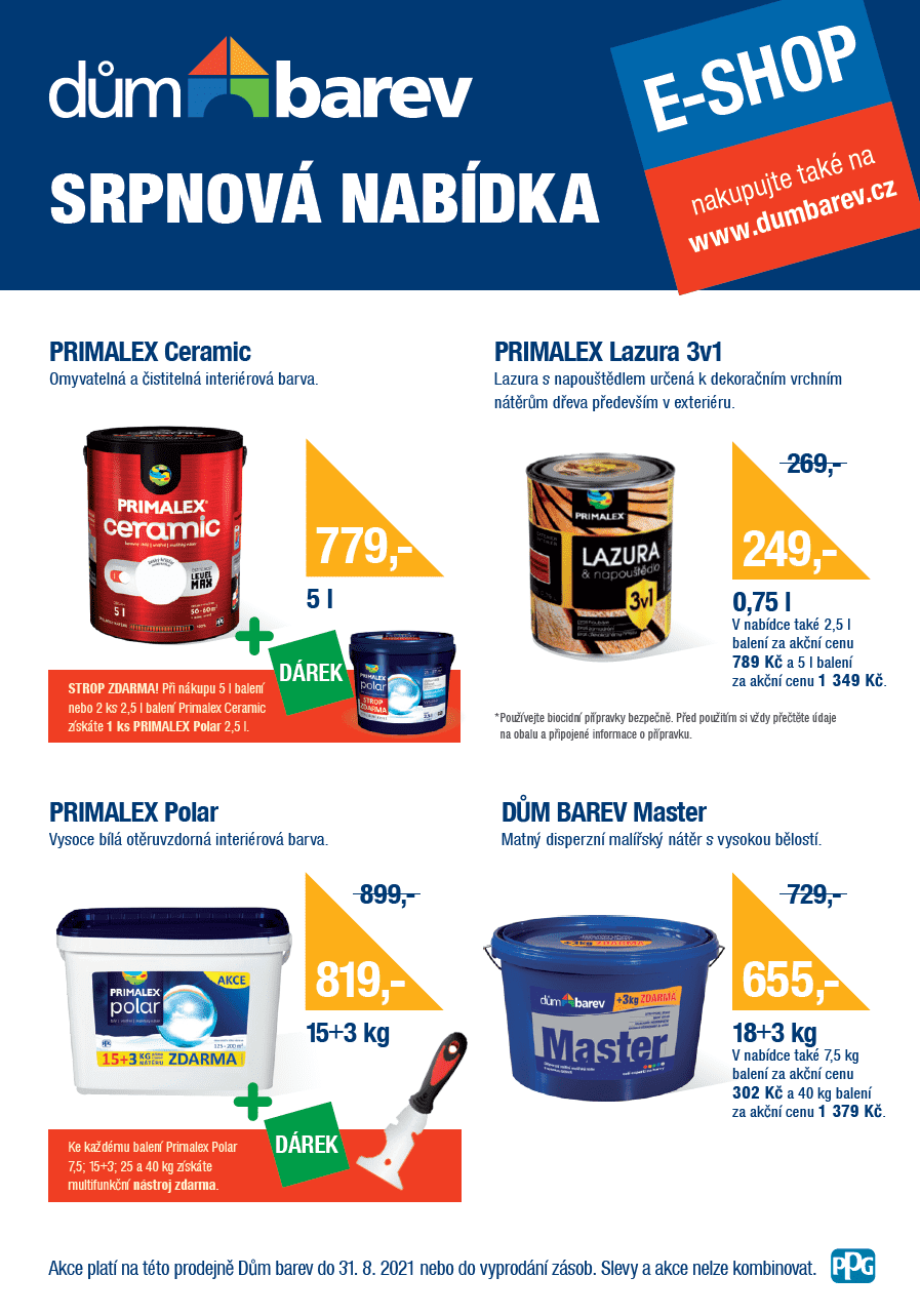 Akce platí na všech prodejnách Dům barev a e-shopu dumbarev.cz do 31. 8. 2021 nebo do vyprodání zásob. Slevy a akce nelze kombinovat.