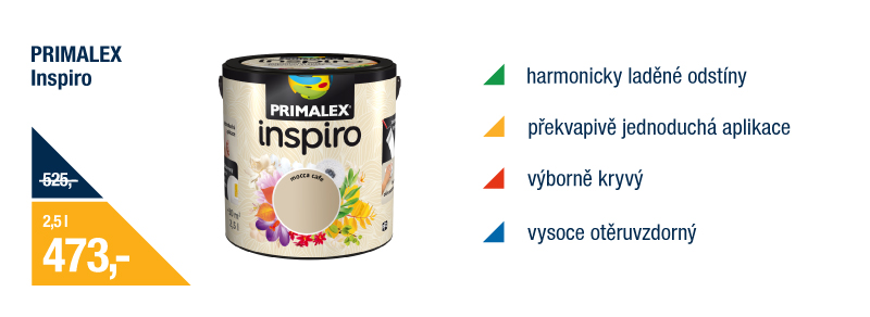 Primalex Inspiro využijete pro malování interiéru, skvěle kryje, jednoduše se aplikuje a zanechává dokonalý vzhled. Vybrat si můžete z několika designových odstínů.