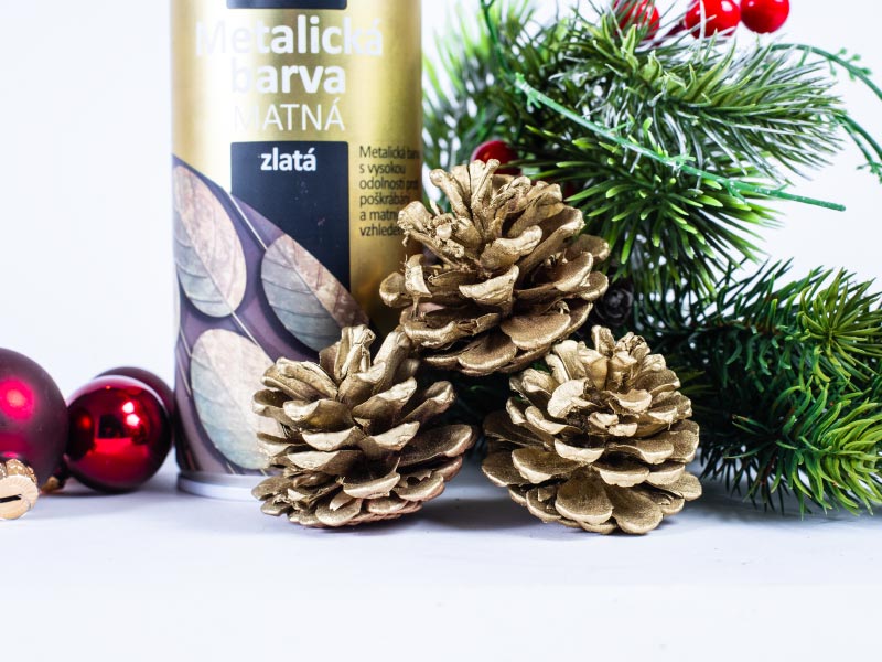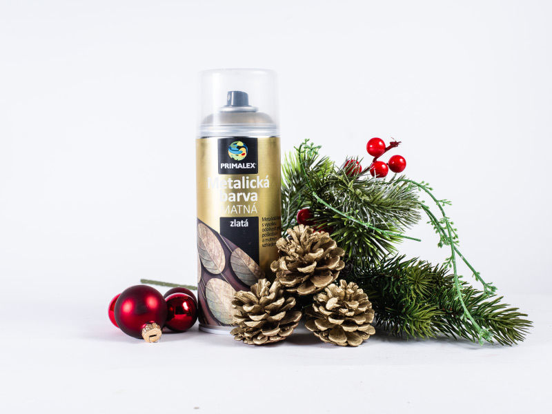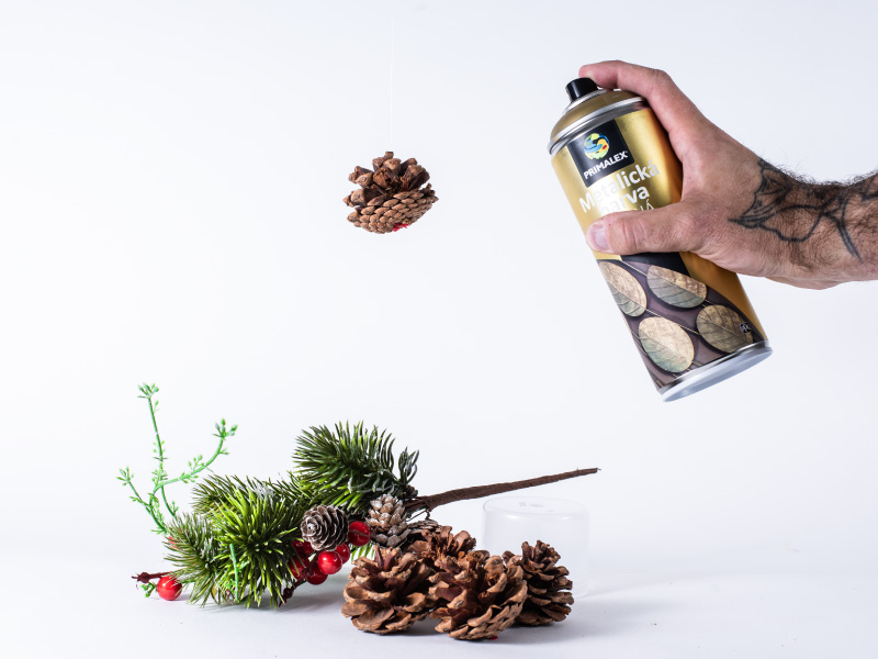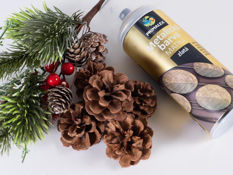 - Šišky, metalický sprej Primalex libovolné barvy, rukavice
