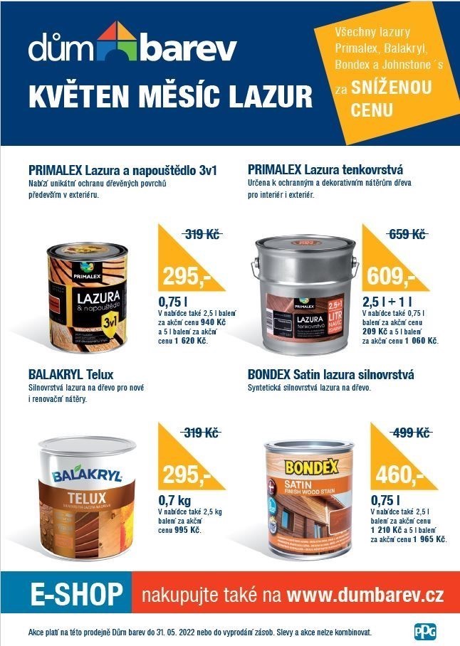 „První Máj, lazury čas…“Máte v plánu renovaci zahradního nábytku, plotu či pergoly? Všechny lazury PPG máme nyní za zvýhodněnou cenu!