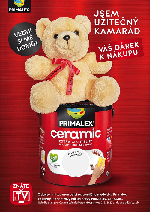 Za každý jednorázový nákup Primalex Ceramic jakékoliv velikosti balení obdržíte 1x plyšového medvídka. V případě nákupu na e-shopu si medvídka vyzvednete při odběru zboží na vámi vybrané prodejně.
