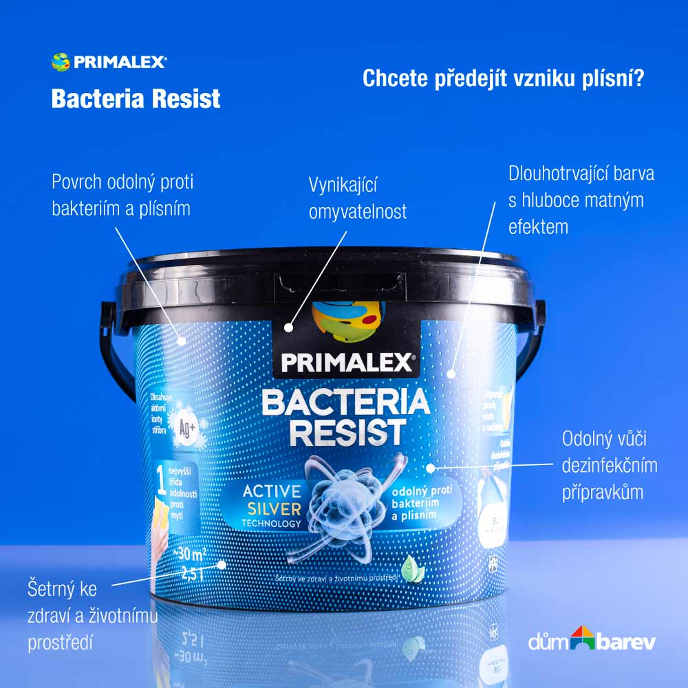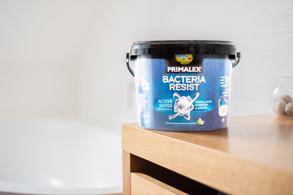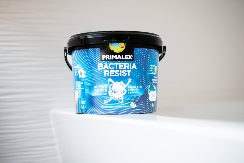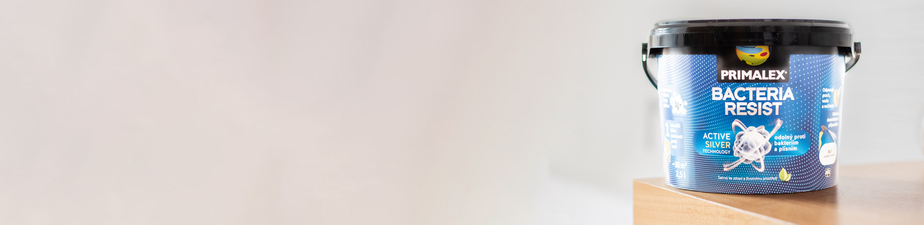 Bakterie najdete v každém prostředí. Avšak na určitých místech, jako jsou například nemocnice a ambulance, je důležité eliminovat jejich výskyt. Jak se bakterie nejčastěji přenáší? Pomocí rukou, což může vést ke vzniku infekce. Té se dá předejít kromě zvýšené hygieny a pravidelného čištění povrchů právě aplikací omyvatelného nátěru Primalex Bacteria Resist, který potlačuje množení bakterií.Technologie ACTIVE SILVER znamená, že nátěr obsahuje aktivní ionty stříbra, které zabraňují množení bakterií a zároveň odpuzují prach, vodu a nečistoty. Tím se tento nátěr liší od běžných antibakteriálních nátěrů, které fungují na jiném principu, kdy se jejich účinnost snižuje v čase nebo pro aktivní funkčnost potřebují UV záření, což není vždy technicky možné. Primalex Bacteria Resist je navíc odolný vůči dezinfekčním přípravkům.