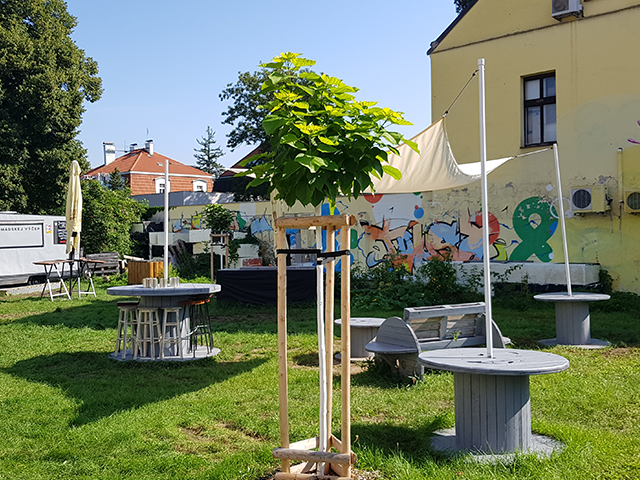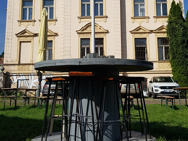 Vedle laviček z euro palet jsme oživovali také stoly z použitých kabelových cívek anebo dřevem obložené odpadkové koše. Kde to šlo, použili jsme pro zvýraznění kresby dřeva Tenkovrstvou lazuru Primalex. Kde bylo dřevo horší kvality, vypomohla Vrchní barva Primalex, která překryla jeho nedostatky. Třešničkou na dortu byla úprava dřevěných krytů mobilních toalet, u kterých by po našem zásahu jen málokdo odhadl jejich pravý účel. Zrenovovali jsme také ze dřeva vytvořený nápis „“Dvorek na Letné“ sloužící k nalákání kolemjdoucích.