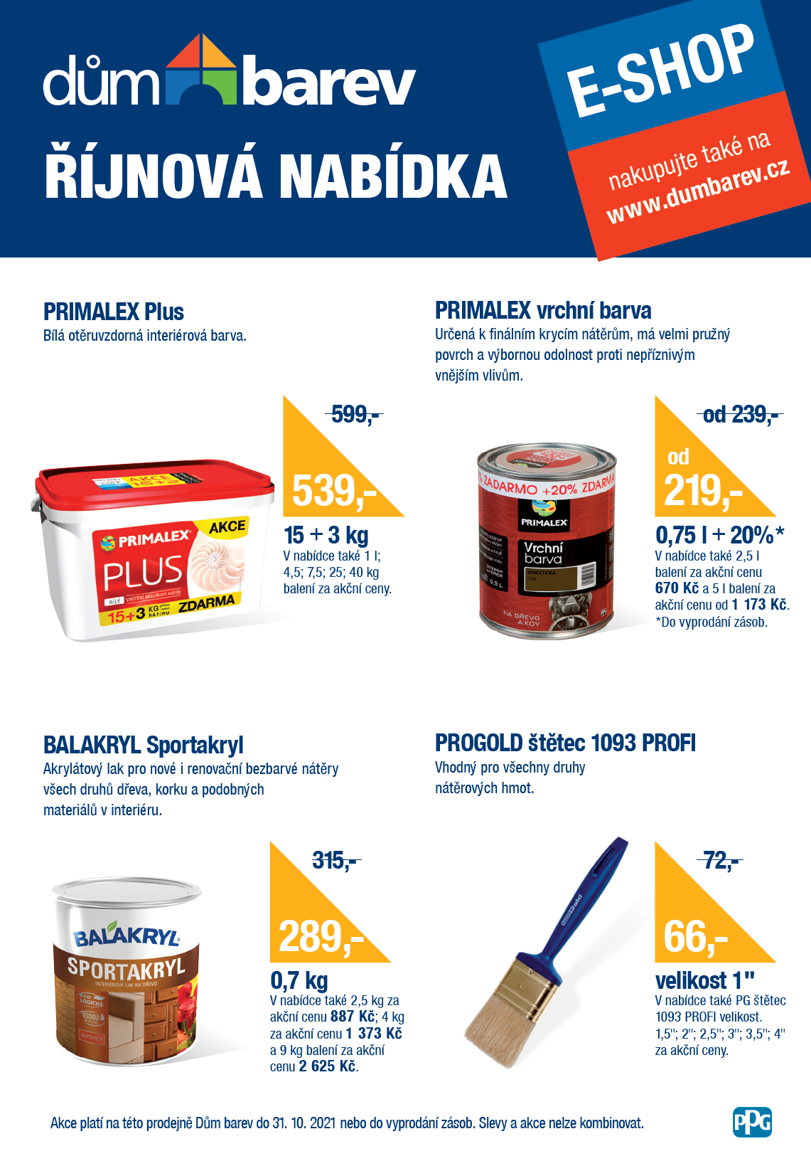 - Primalex Vrchní barva 0,75 l + 20 % od 219 Kč (v nabídce také 2,5 l za 670 Kč, 5 l za 1 173 Kč)