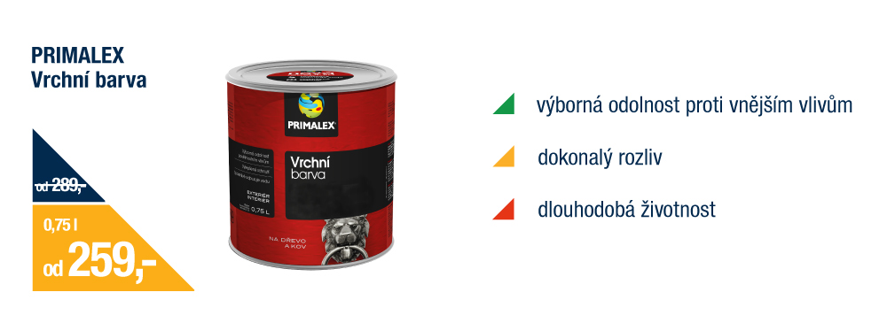 Pokud potřebujete natřít dřevo nebo kov, doporučujeme Primalex Vrchní barvu, která zanechává sametově matný vzhled. Má dlouhodobou životnost a výborně odolává vůči vnějším vlivům.