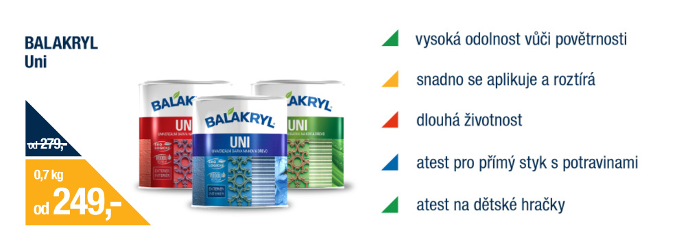 Balakryl UNI je vodou ředitelná vrchní barva, která je vhodná k použití na rozličné povrchy – dřevo, kov i beton a mnoho dalších. Použít lze jak v interiéru, tak v exteriéru. Výhodou je i atest pro hračky a přímý styk s potravinami.