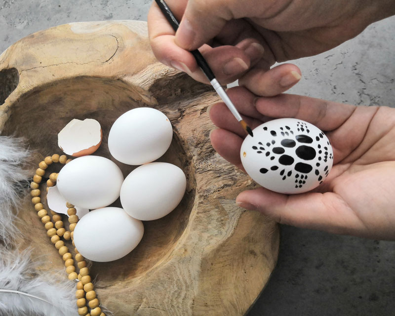 Připravte si vyfouklá a očištěná vajíčka. Poté rozmíchejte Balakryl UNI a štětcem namalujte na vajíčka libovolné vzory a obrázky podle toho, co se vám líbí. Kraslice můžete nazdobit puntíky, čárkami, křížky nebo třeba hvězdičkami. Fantazii se meze nekladou. A pokud se vám náhodou stane, že vám při vyfukování vajíčko praskne, nezoufejte! Umyjte rozbitou skořápku a namalujte i ji. Spolu s celými kraslicemi budou tvořit jedinečnou výzdobu.