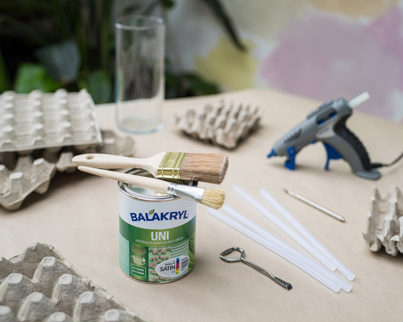 Budete potřebovat: skleněnou vázu, prázdná plata, tavnou pistoli, štětec a Balakryl UNI libovolné barvy.