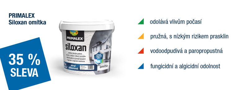 Speciální pastovitá omítka na bázi organické disperze obsahující mikrovlákna pro vyšší pružnost a silikonová aditiva, díky kterým lépe odpuzuje vodu, to je Primalex Siloxan.