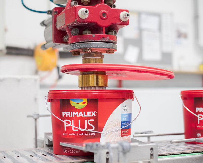 Schválená hmota je na automatických linkách stáčena do obalů. Aktuálně jsou na trhu balení o hmotnosti 1,5 kg až 40 kg. Za jednu směnu se v Břasích vyrobí až 80 palet! Ty jsou následně kamiony převezeny do skladů v Nehvizdech u Prahy, Modřicích u Brna a ve slovenských Petrovanech, odkud míří do určených prodejen. Primalex Plus si tak můžete zakoupit ve 110 prodejnách Dům barev nebo na e-shopu.