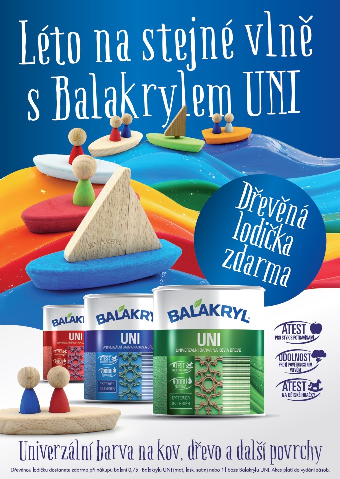 A my vám k tomu přidáme i malou radost navíc. Stačí, když si u nás pořídíte jakékoliv balení oblíbené barvy Balakryl UNI — ať už zvolíte mat, satin nebo lesk — a jako dárek od nás získáte dřevěnou lodičku ZDARMA.